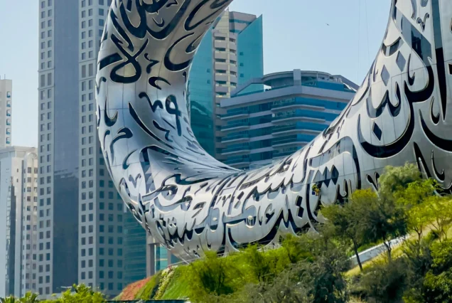 Standing 77 meters tall, the Museum of the Future is an architectural icon designed by Shaun Killa. Its unique oblong torus shape (ring with an open center) is made from 1,024 robotically fabricated stainless steel panels. The façade features engraved Arabic calligraphy by artist Mattar bin Lahej, quoting HH Sheikh Mohammed bin Rashid Al Maktoum on knowledge, innovation, and Dubai’s future.
